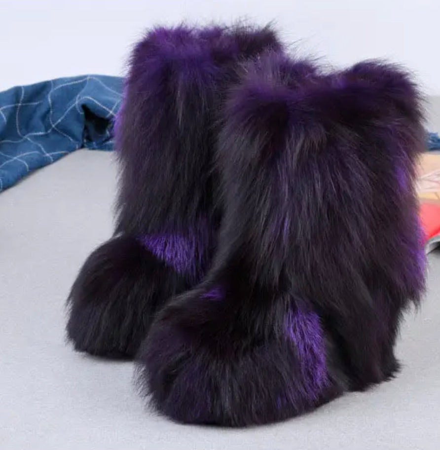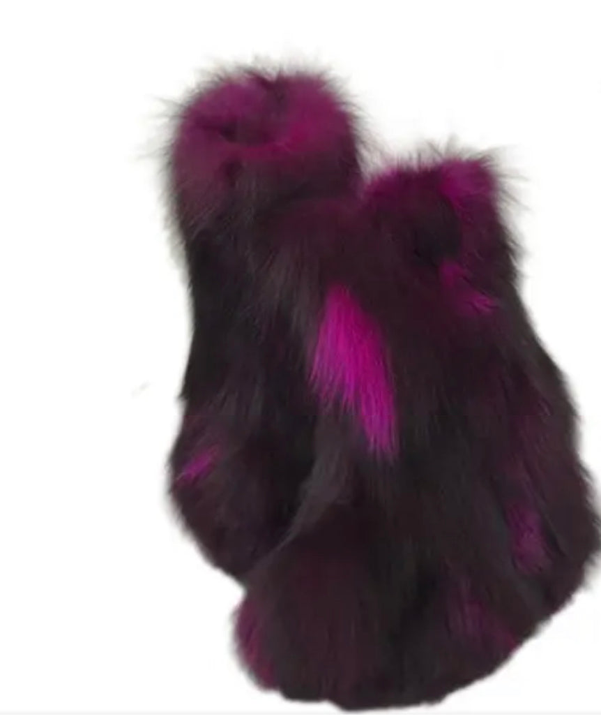 Real fox fur boots Royal and dark blue natural pink and burgundy purple and plum fur so color combination may vary cut small size up rubber grip boots warm interior preorder only made when ordered take 2 weeks beautiful boot with comfy cushion interior