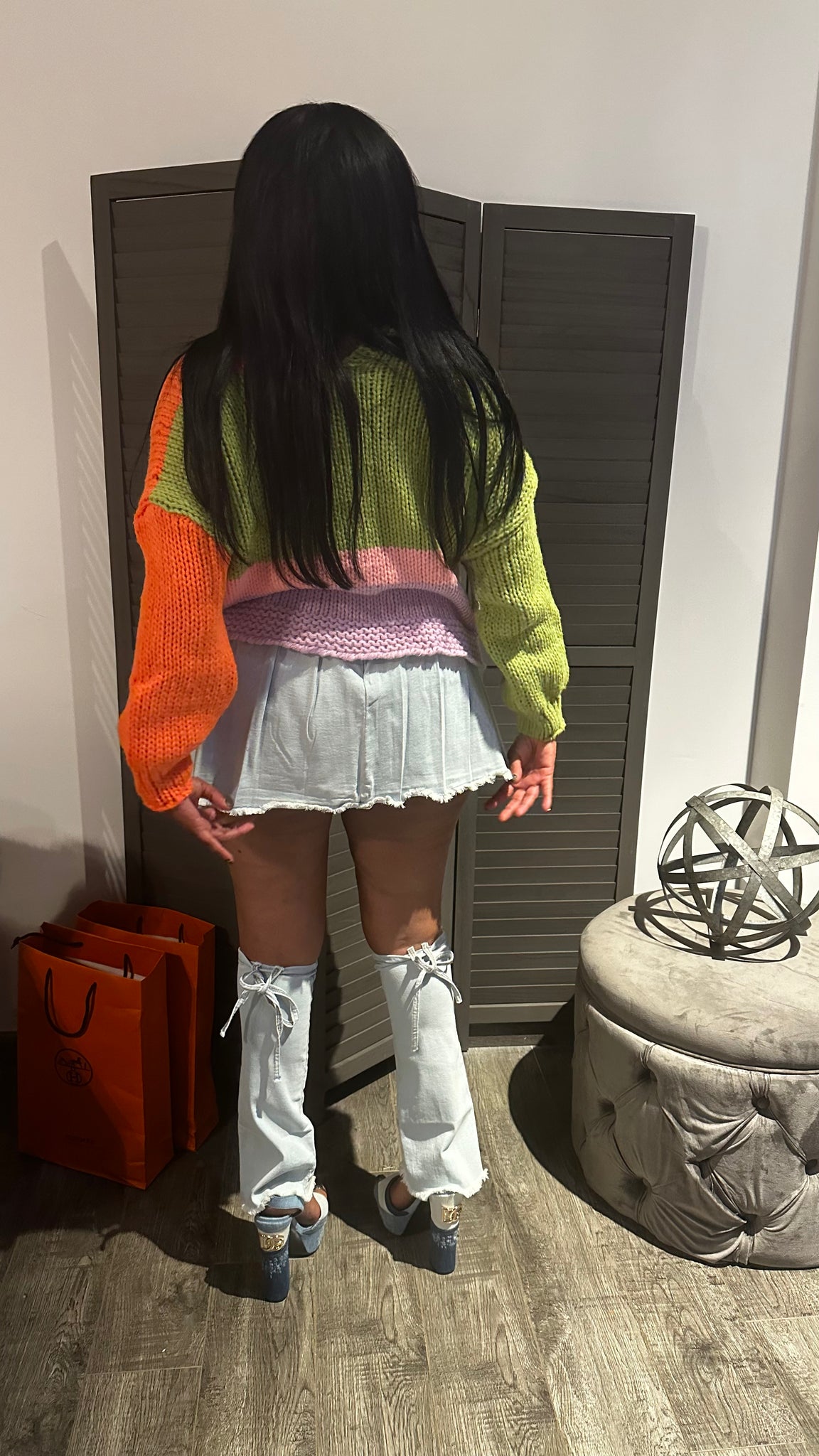 Denim pleated skirt with denim leg cuffs has stretch