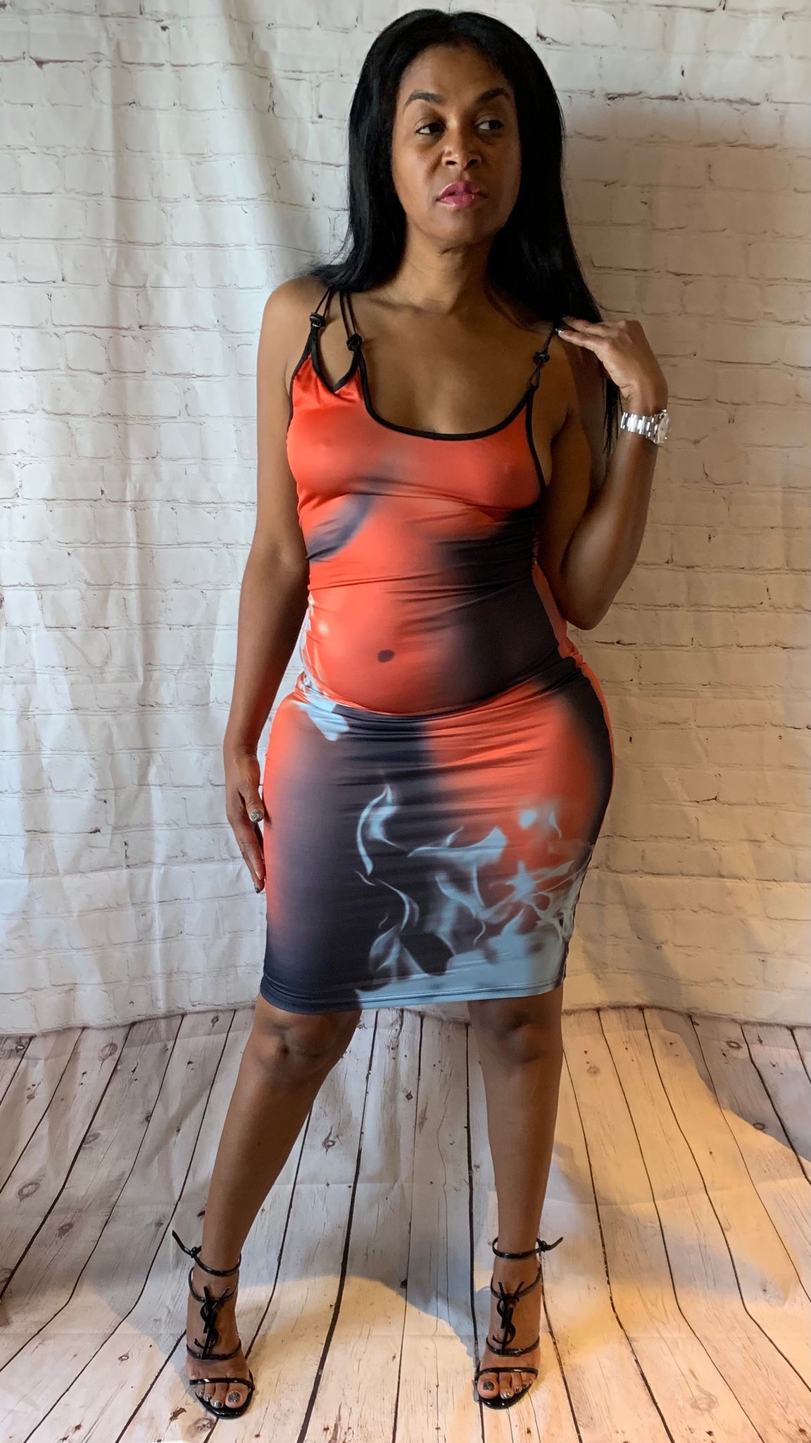 Flame print dress with adjustable straps good stretch