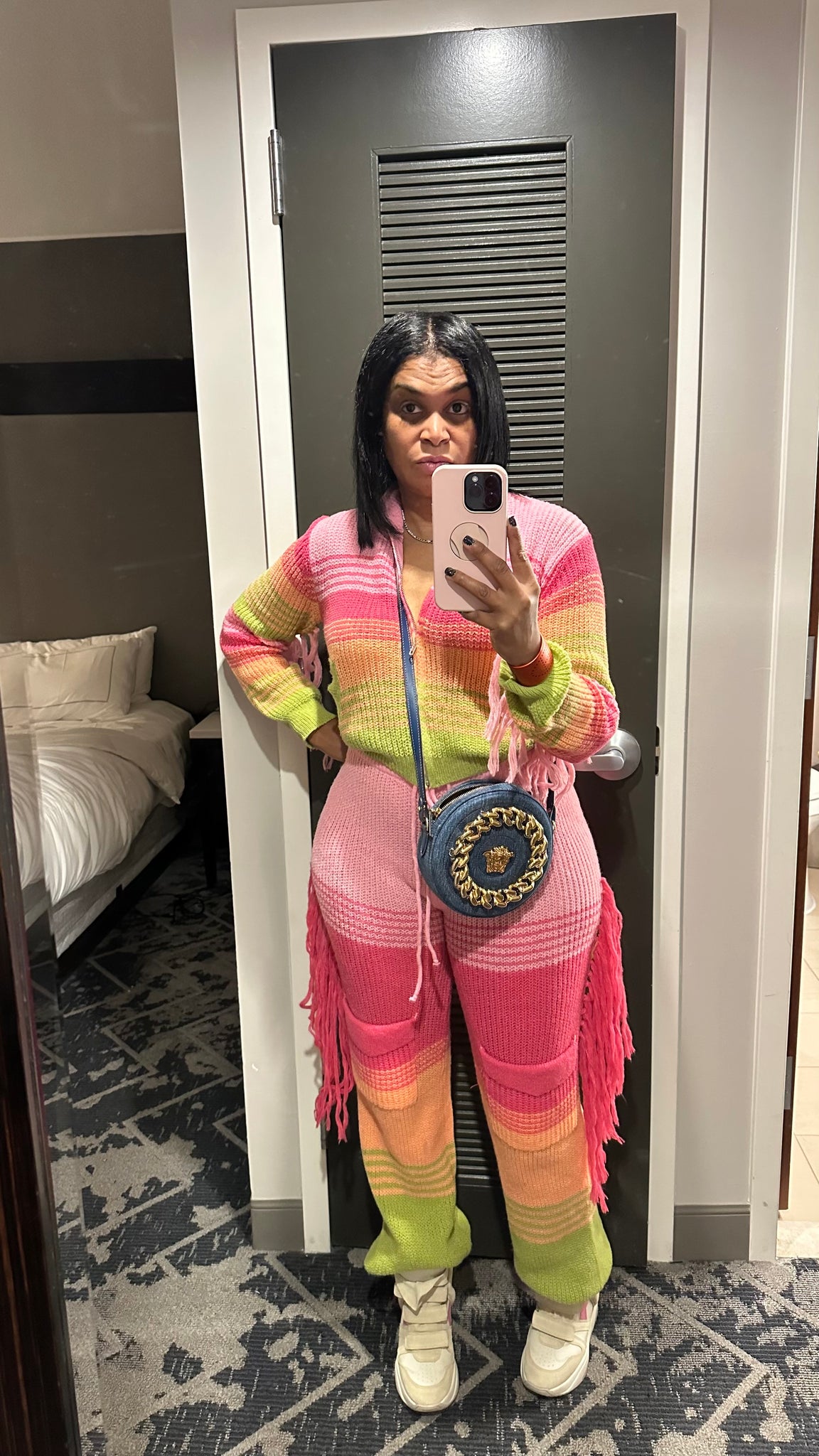2 piece sweater set with fringes in bright color good stretch zip front jacket pant with drawstring model wearing size large top pre-order only 2-3 weeks